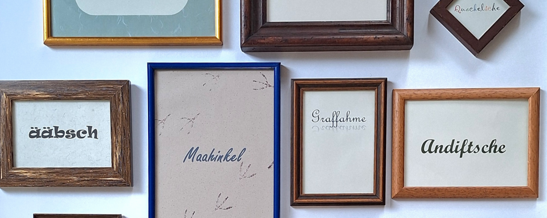 Die Kabinettausstellung »Mer sacht net sescht, mer sescht, mer sacht« im Balkonfoyer, von Günter Stolzenberger und Klara Kletzka kuratiert, gibt seltenen, originellen und vom Aussterben bedrohten hessischen bzw. frankfurterischen Wörtern und Redewendungen im wahrsten Sinne des Wortes einen Rahmen. Besucherinnen und Besucher können rund 60 Dialektwörter und Ihre Bedeutung kennenlernen – inklusive Mitmachaktion und Begleitprogramm!